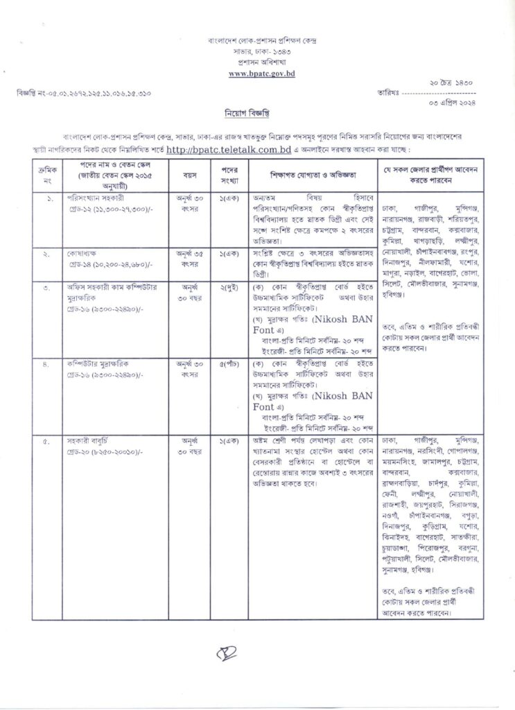 BPATC job circular 2024-লোক-প্রশাসন প্রশিক্ষণ কেন্দ্র নিয়োগ বিজ্ঞপ্তি