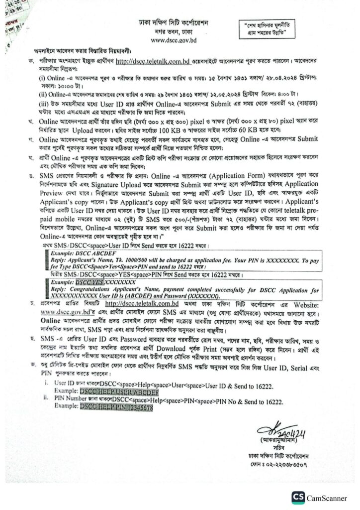 আবেদন প্রক্রিয়া: আবেদন করতে হবে অনলাইনে http://dscc.teletalk.com.bd ওয়েবসাইটের মাধমে অনলাইনে আবেদনপত্র পাঠাতে হবে। অনলাইনে আবেদন জমা দেওয়ার সময় থেকে পরবর্তী ৭২ ঘণ্টার মধ্যে মোবাইলে এসএমএসের মাধ্যমে পরীক্ষার ফি জমা দিতে হবে।