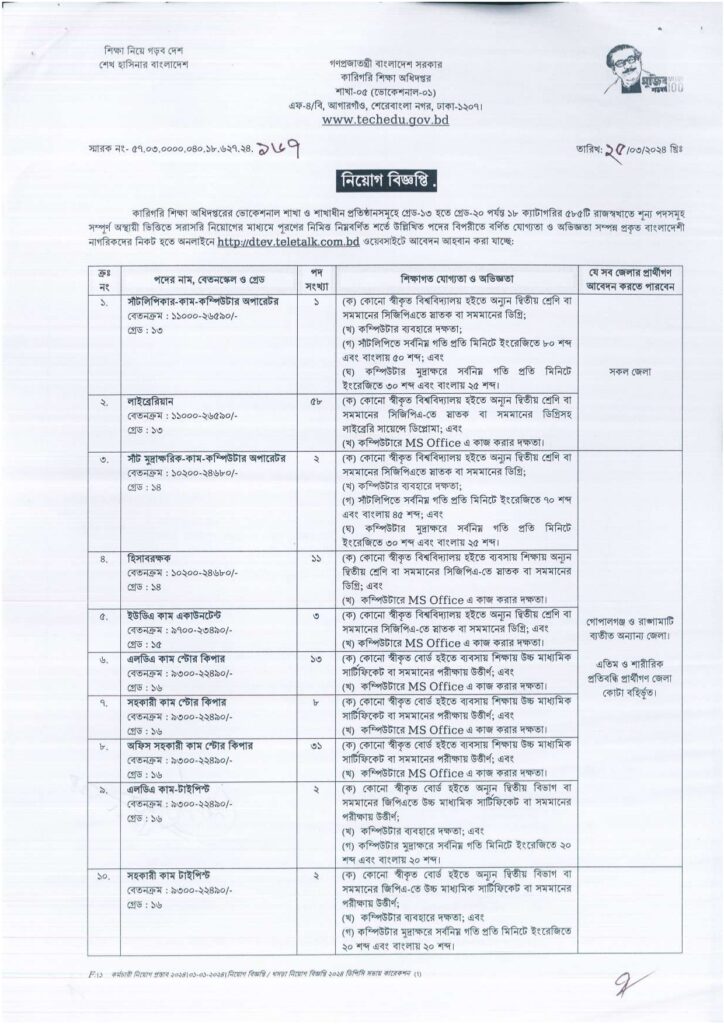 Directorate of Technical Education Job Circular 2024: কারিগরি ও মাদ্রাসা শিক্ষা বিভাগ, শিক্ষা মন্ত্রণালয়ের আওতাধীন কারিগরি শিক্ষা অধিদপ্তরের শূন্য পদসমূহে জনবল নিয়োগের বিজ্ঞপ্তি প্রকাশ হয়েছে। কারিগরি শিক্ষা অধিদপ্তর ১৮ টি পদে মোট ৫৮৫ জনকে নিয়োগ দেবে। আগ্র্রহী প্রার্থীরা অনলাইনে আবেদন করতে পারবেন। নারী ও পুরুষ উভয়কেই নিয়োগ দেওয়া হবে। এই চাকরিতে সকল জেলার প্রার্থীদের আবেদন করার সুযোগ আছে। আগ্রহ ও যোগ্যতা থাকলে আপনিও আবেদন করতে পারেন। সম্পূর্ণ বিজ্ঞপ্তি বিস্তারিত দেওয়া হল।