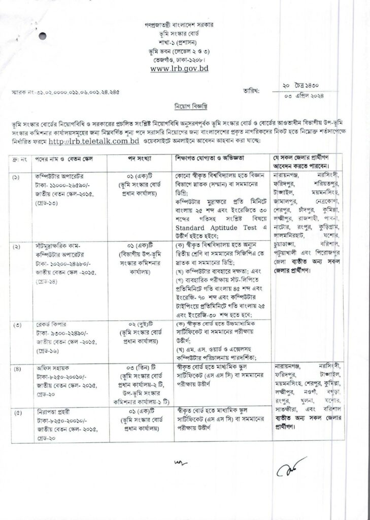 বাংলাদেশ ভূমি সংস্কার বোর্ড ও বোর্ডের আওতাধীন নিম্নোক্ত বিভাগীয় উপ-ভূমি সংস্কার কমিশনার কার্যালয় সমূহের জন্য নিম্নবর্ণিত শূন্য পদে সরাসরি জনবল নিয়োগের জন্য নিয়োগ বিজ্ঞপ্তি প্রকাশ (LRB Job Circular 2024)হয়েছে। ভূমি সংস্কার বোর্ড ০৫টি পদে মোট ০৮ জনকে নিয়োগ দেবে। পদ গুলোতে নারী-পুরুষ উভয়েই আবেদন করতে পারবেন। আগ্রহী প্রার্থীরা অনলাইনে আবেদন করতে পারবেন। সম্পূর্ণ বিজ্ঞপ্তি বিস্তারিত দেওয়া হল।