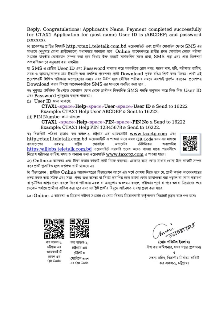 To apply for the CTAX1 job, visit the CTAX1 job application website at http://ctax1.teletalk.com.bd and pay the CTAX1 job application fee using only the Teletalk pre-paid mobile number.