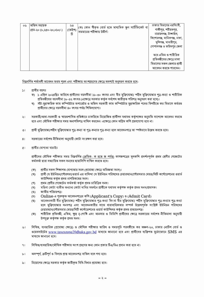 গণপ্রজাতন্ত্রী বাংলাদেশ সরকার অর্থ মন্ত্রণালয় অভ্যন্তরীণ সম্পদ বিভাগ থেকে কর কমিশনের নিয়োগ বিজ্ঞপ্তি (Taxes Zone 20 Dhaka Job Circular 2024) প্রকাশ হয়েছে। কর কমিশনারের কার্যালয়, কর অঞ্চল-২০, ঢাকা এর অধীনে ০৬ টি পদে মোট ১০২ জনকে নিয়োগ দেবে। পদগুলোতে নারী ও পুরুষ উভয়েই আবেদন করতে পারবেন। আগ্রহী প্রার্থীরা অনলাইনে আবেদন করতে পারবেন। সম্পূর্ণ বিজ্ঞপ্তি বিস্তারিত দেওয়া হল।